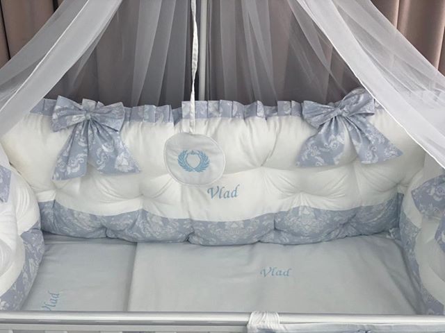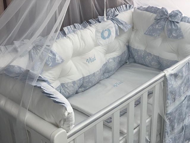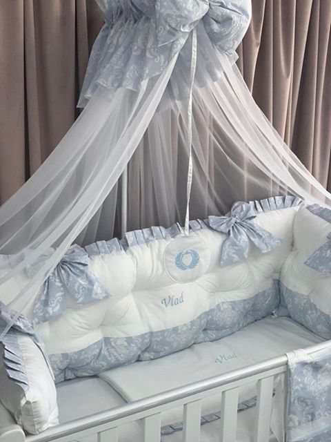 PEPPIbambini ROYAL White Blue Vlad Baby-Bettwaren, 11-teilig, Bettwäsche, 100% Baumwolle mit Stickerei + Moskitonetz